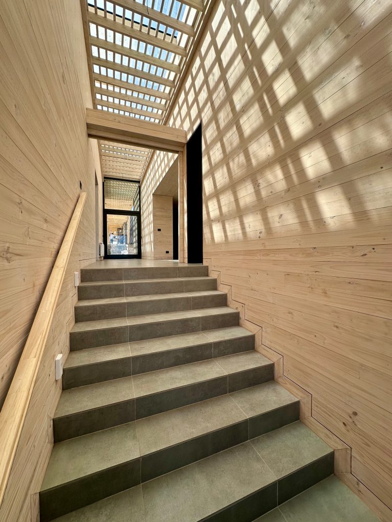 Un edificio que se ajusta con lógica rigurosa: cinco niveles más uno retirado, una volumetría contenida, pero intensamente trabajada.